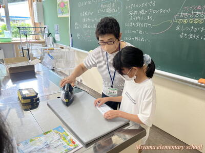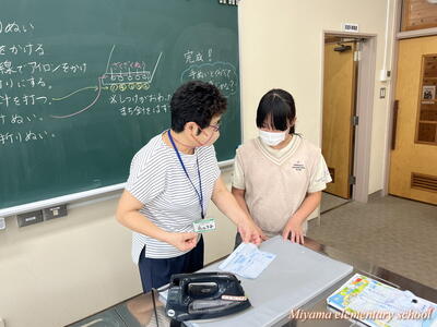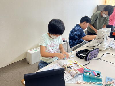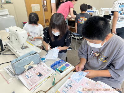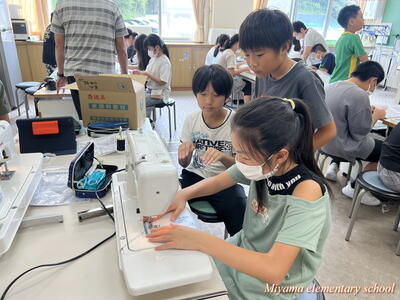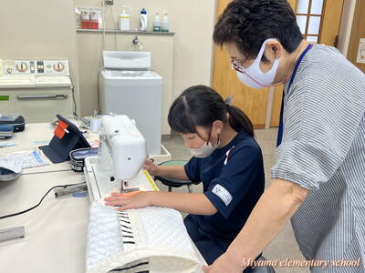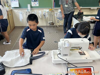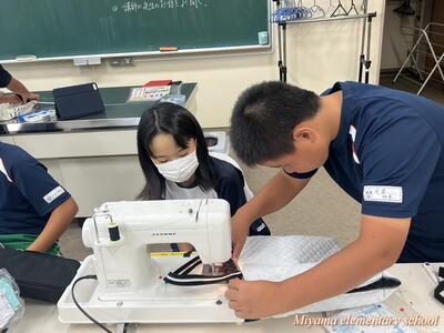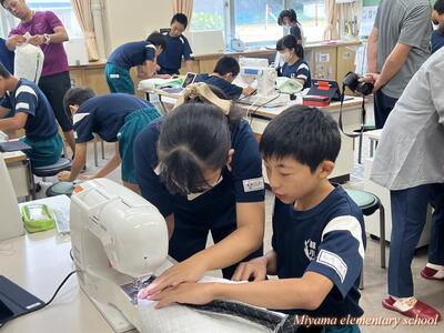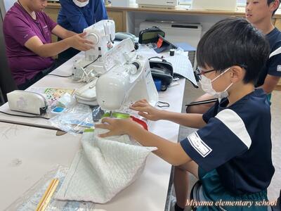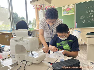 今日も、昨日に引き続き、ミシンの使い方を教えていただく地域の先生に来校いただきました。今日は5年生の支援です。5年生は、手縫いを学習したばかり。ミシンは当然初めてです。練習布を使って、指定されて部分を縫ったり、方向を変えて縫ったりしました。基本の縫い方をマスターすると、何かを作りたくなります。コースターや小銭入れをつくっていました。「手縫いより、丈夫にできた」と感想をもった子もいました。