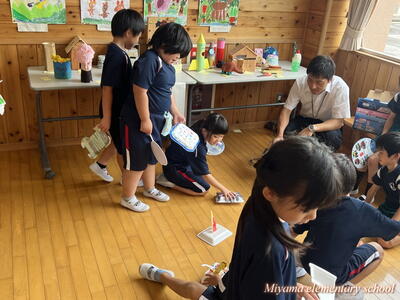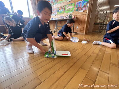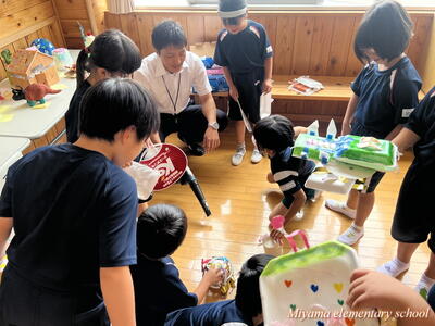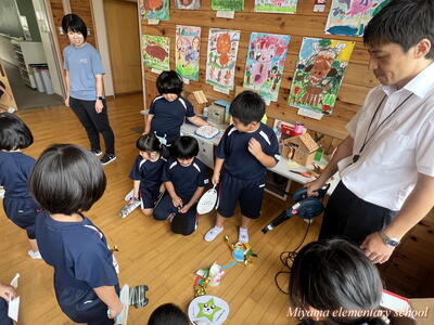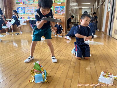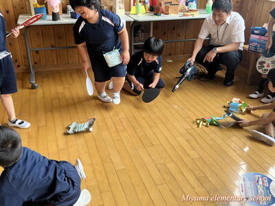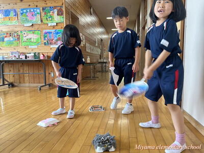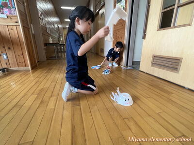 1年生は図工の時間につくったおもちゃで楽しく遊びました。おもちゃは、各家庭からご協力いただいた食品トレーやカップ麺の容器でつくりました。ご協力ありがとうございました。かっこいいワニだったり、すてきな船だったり、かわいい動物だったり。軽い容器で作ったので、うちわで扇ぐとふわっと動きます。うちわで必死に扇ぐ子どもたちもかわいいです。