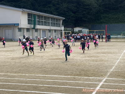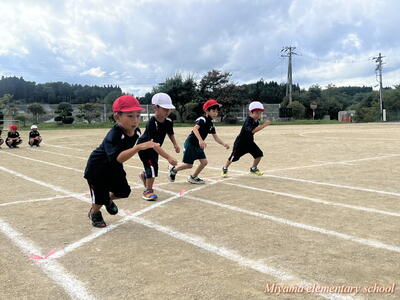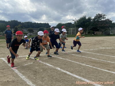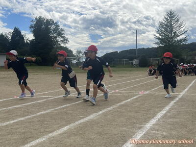 1・2年生は徒競走を練習をしました。直線からカーブに入るところは、友達とぶつからないようにします。なかなかの力強い走りです。