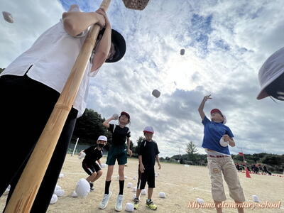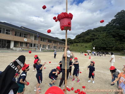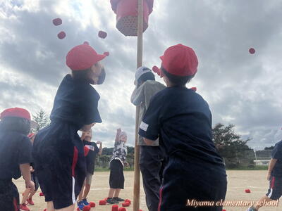「エア」ではない、ホントの玉入れも練習。自分の頭の上にあるかごに入れるのは、結構難しい。ねらいを定めて、上手に入れましょう。