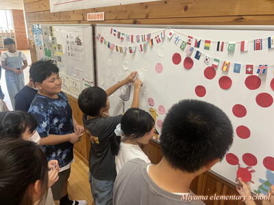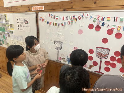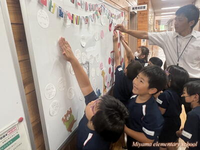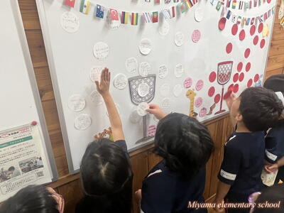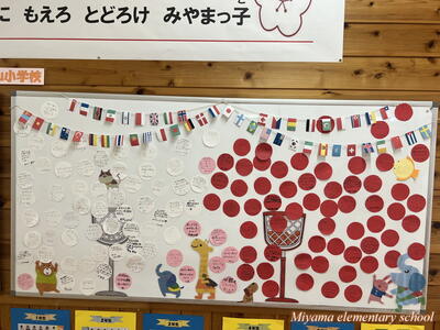 職員室前の掲示板に、一人一人がどんな運動会にしたいのかを書いて掲示しました。紅白それぞれに、丸い画用紙に思いを書いて貼ります。みんなの思いが実現する運動会にしたいですね。
