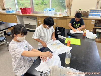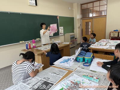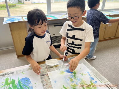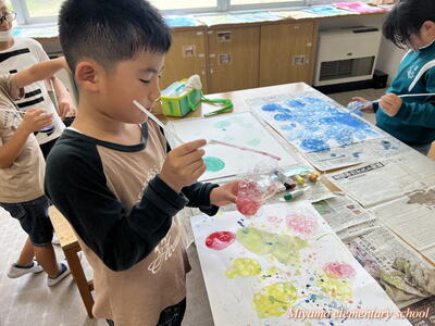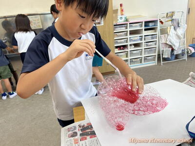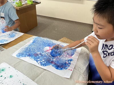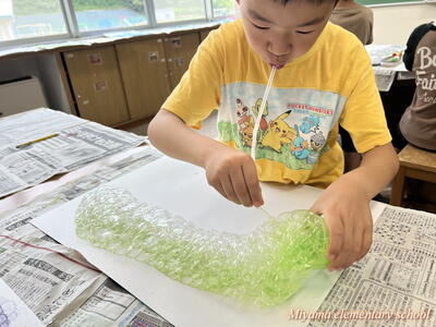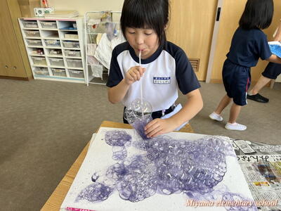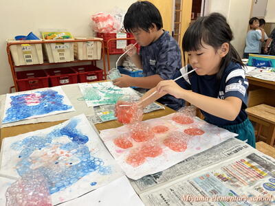 2年生は、図工で絵の具に石けん水とのりを混ぜて、あわを作り、それを画用紙に写して模様を楽しむ活動をしました。石けん水を混ぜた絵の具は、ストローで吹くとぶくぶくとあわになります。それだけでも楽しいのですが、それが画用紙につくと、思いもしない模様がどんどんできます。きれいなあわの形に歓声をあげながら、いろいろな模様づくりを試していました。できた模様から想像が膨らみますね。