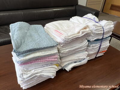 市の社会福祉協議会より、美山小学校に雑巾を寄贈いただきました。その数、なんと100枚です。たくさんの雑巾をありがとうございました。校舎をきれいにする活動でつかわせていただきます。