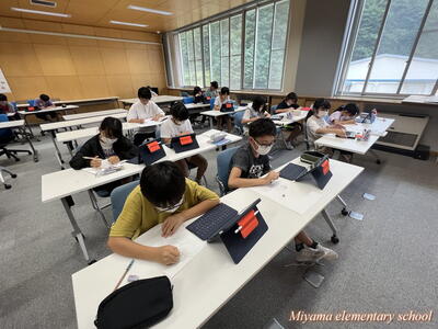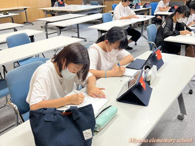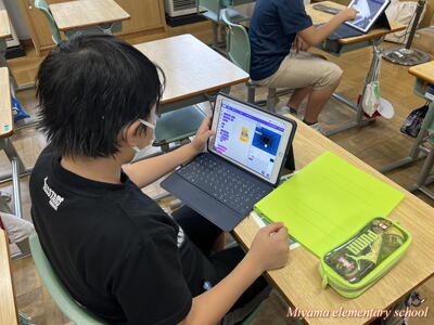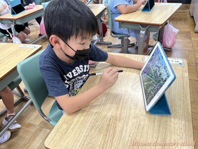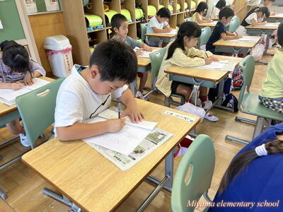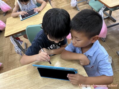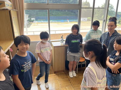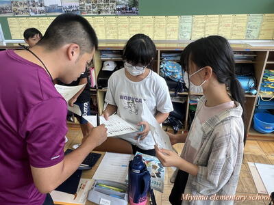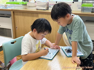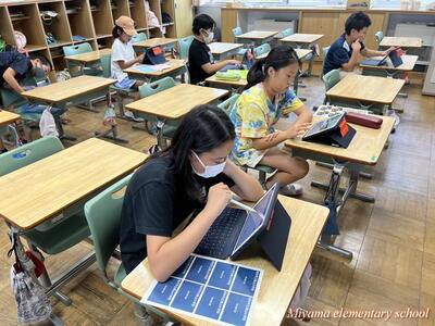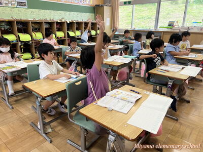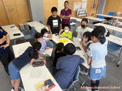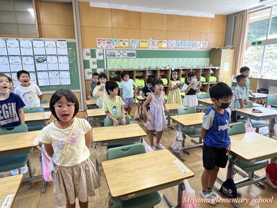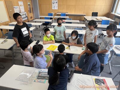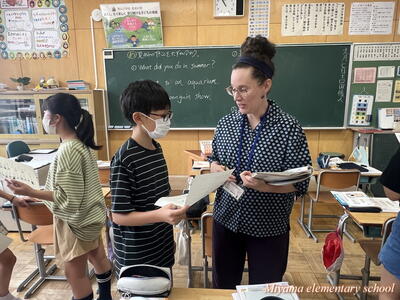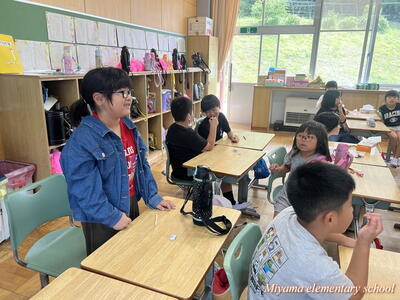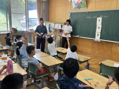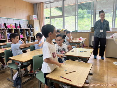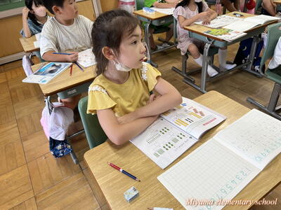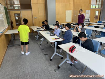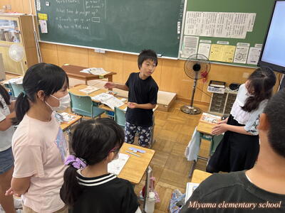 外国語では、5・6年生が少し難しい表現に挑戦していました。「何時に起きるの?」「いつもは6時頃だよ」など、生活の時間を質問し合っていたのが5年生。「夏休みどうだった?」「水族館に行って、ペンギンのショーをみたよ」など、夏休みの出来事を質問し合っていたのが6年生。なかなかの高度な会話です。頭をフル回転して、友達と質問をし合っていました。