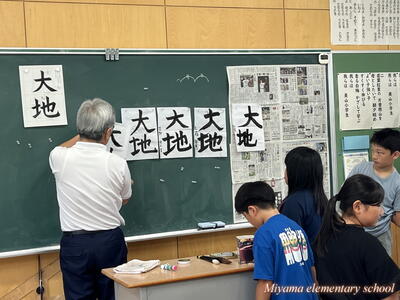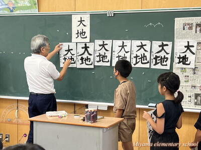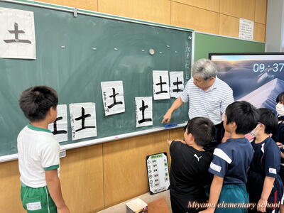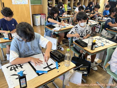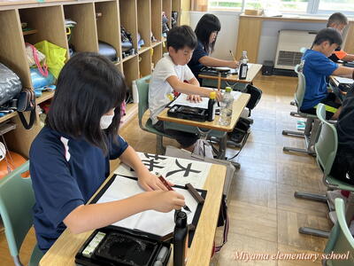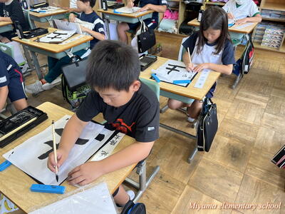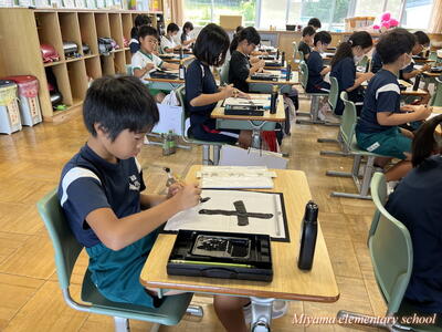 今日も、地域の書道の先生に教えていただきながら、書写コンクールに出品する作品の練習をしました。書写は「手本そっくりに書くことが大切です」と教えていただいたので、手本をよく見て一字一字ていねいに書き上げます。1枚作品を仕上げる度に前に書いた字と比べて、上手になったところを見つけ、次に頑張ることを決めます。少しずつ形の整った字なってきました。