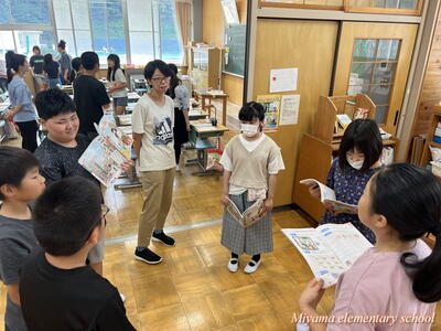 3年生を対象に、お話の会「どんぐり」の皆さんによる読み聞かせが行われました。「スイミー」や「モチモチの木」など、国語の教科書にも載っている物語を、迫力ある大型絵本で読んでいただきました。途中「アジのひらき」という手遊び歌を楽しみながら、本に親しむ時間となりました。