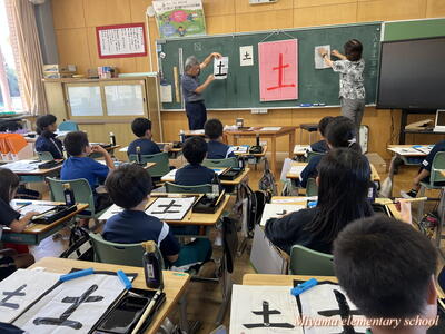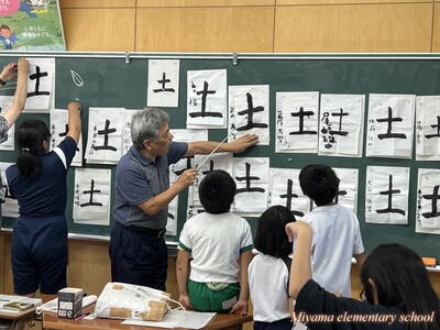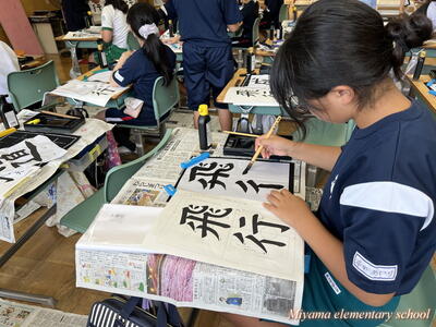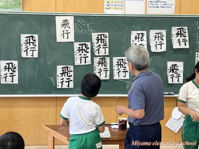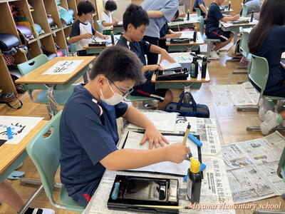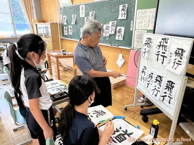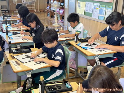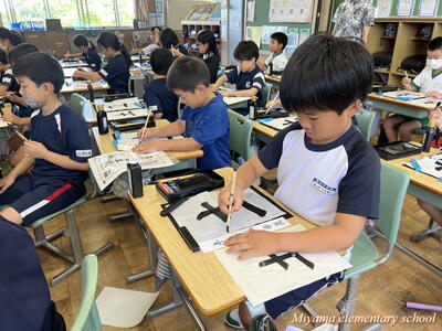 各学年で書写コンクールに向けての練習が始まりました。地域の書道の先生をお迎えし、各学年数回の練習をして作品を仕上げていきます。学年に応じて、筆の運び方や文字のバランスの取り方など細かく教えていただきました。作品はひとつひとつていねいに仕上げます。1時間に書ける枚数は限られますが、その時間に書いた一番よい作品を自分で選びます。選ぶことによって、よい作品するためのポイントを考えることになります。