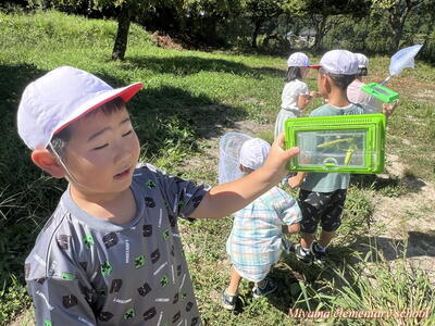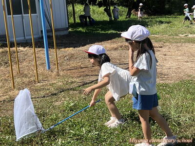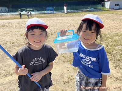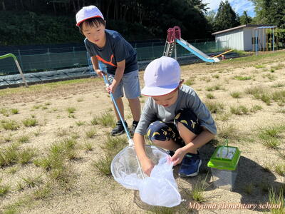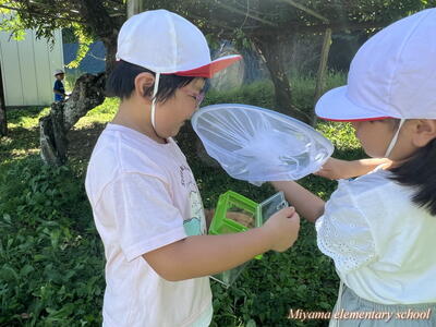 1年生は生活科で校舎周辺の虫さがしをしました。暑くて出てこないかな?と思いきや、草むらにはたくさんの種類の昆虫や生き物がかくれていました。「バッタ見つけた」「カナヘビいたよ」と歓声をあげながら、虫をつかまえていました。もちろん、途中にクーリングタイムを挟みながら短時間集中で! 夢中で虫を追っていると、時間を忘れそうになりますね。