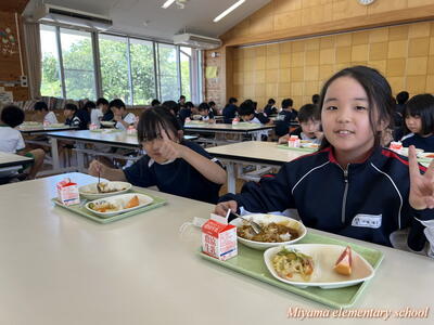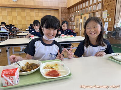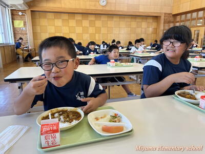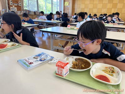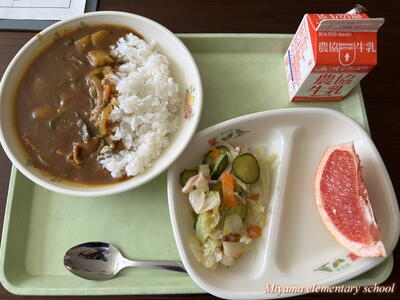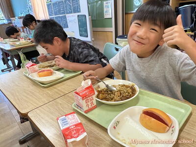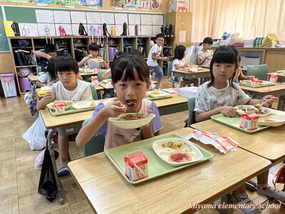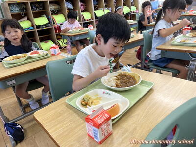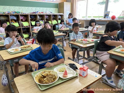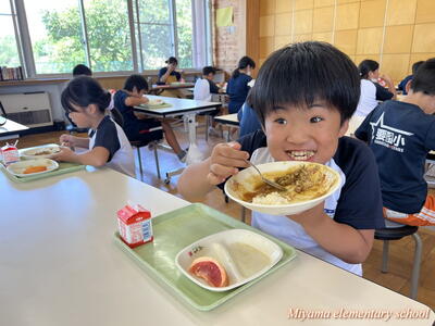 暑い日にはカレーが一番! 大昔にそんなCMがあったような・・・。今日の給食は、田村市の野菜がたっぷり入ったスパイシーカレーでした。ニンジンやジャガイモの他に、なすやピーマンもかくれていました。なすが苦手な子も「カレーの中なら食べられる」と残さず平らげていました。田村市の野菜をおいしくいただきました。明日は防災の日。非常食のコーンポタージュが出ます。