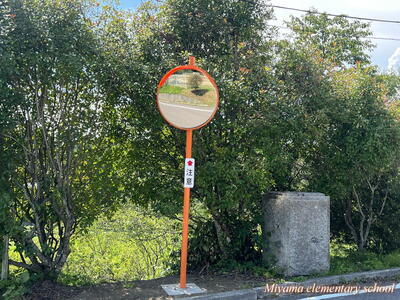 学校坂の頂上付近にカーブミラーが設置されました。坂の頂上付近は、道幅が狭く、歩行者がいることもあります。最徐行したうえで、カーブミラーにて対向車のご確認をお願いします。