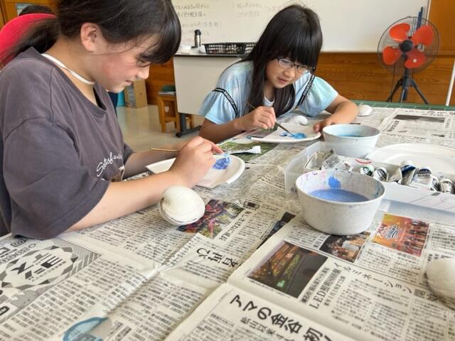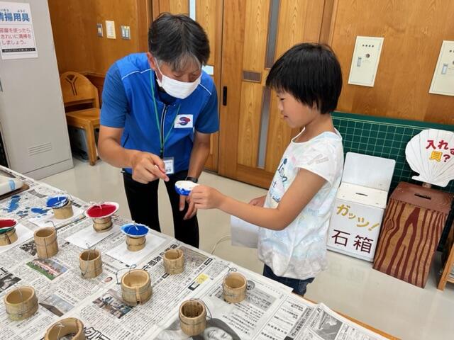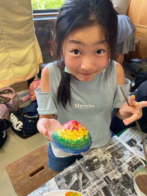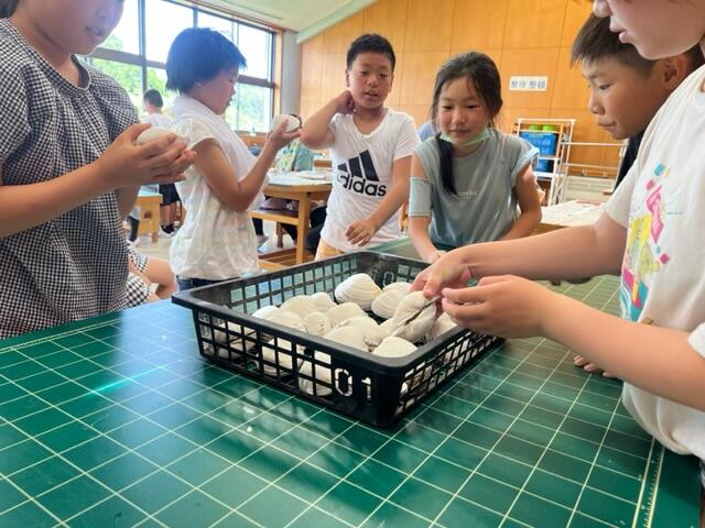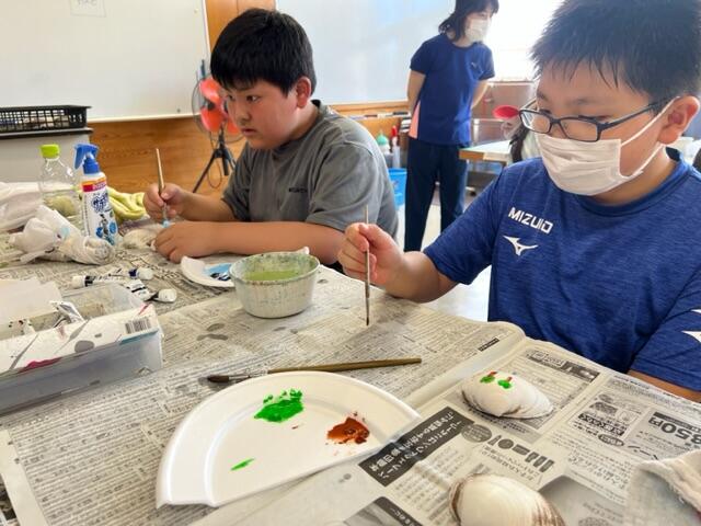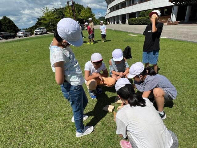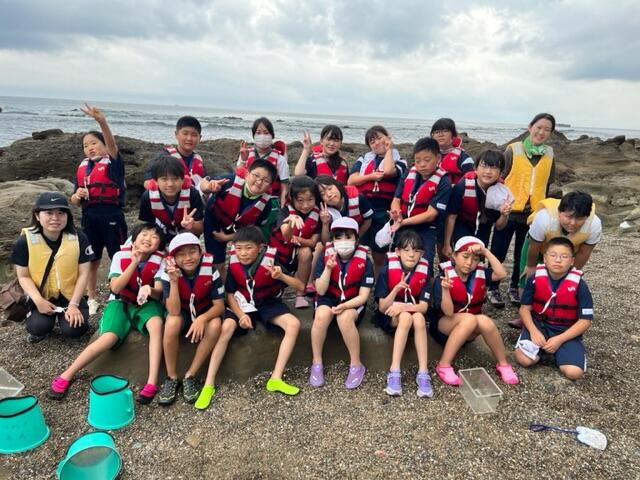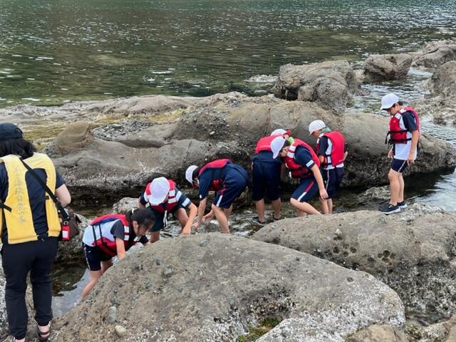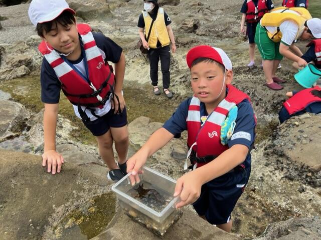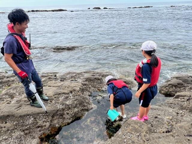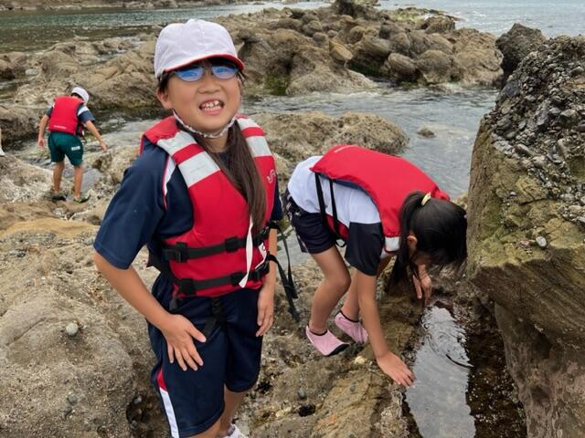 午後の最初の活動は、磯遊びです。雨の予報でしたが、天は子どもたちに味方してくれました。舟戸海岸で磯にいる生き物を探しました。あまりに夢中で探していたので、子どもたちが、みんな下を向いています。イソギンチャクアメフラシなどたくさんの生き物を見つけました。