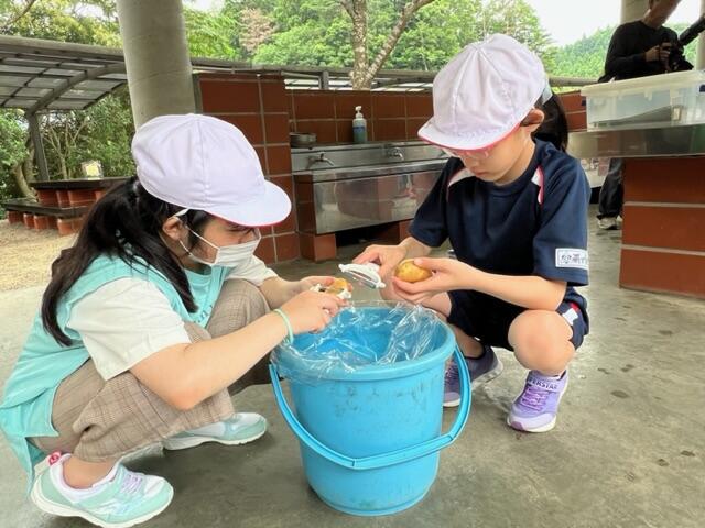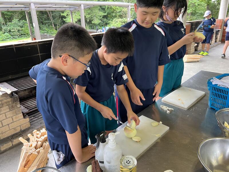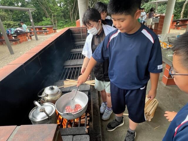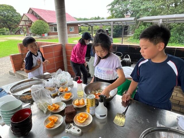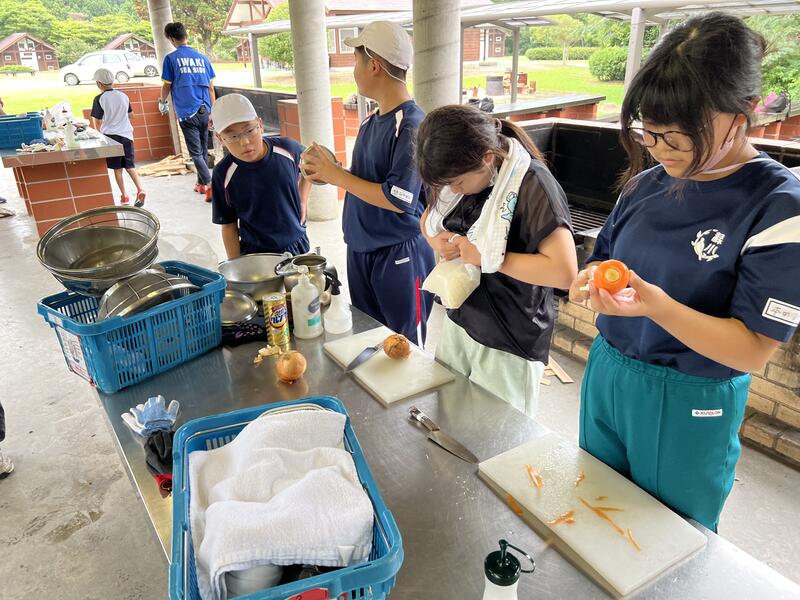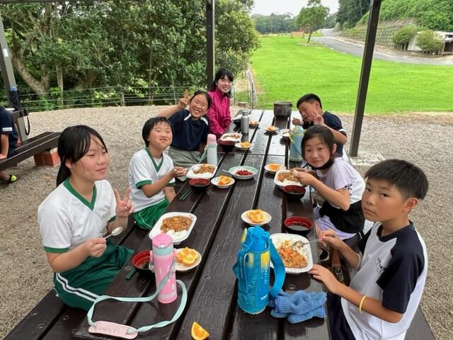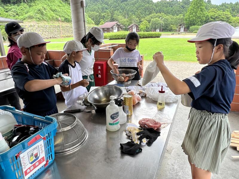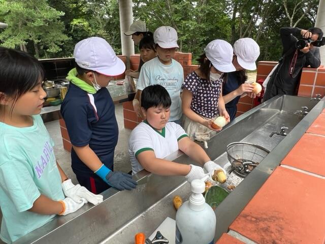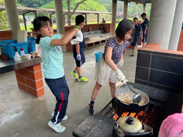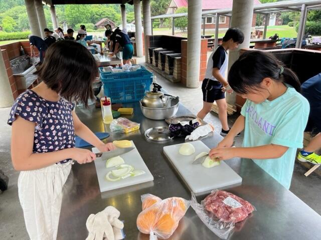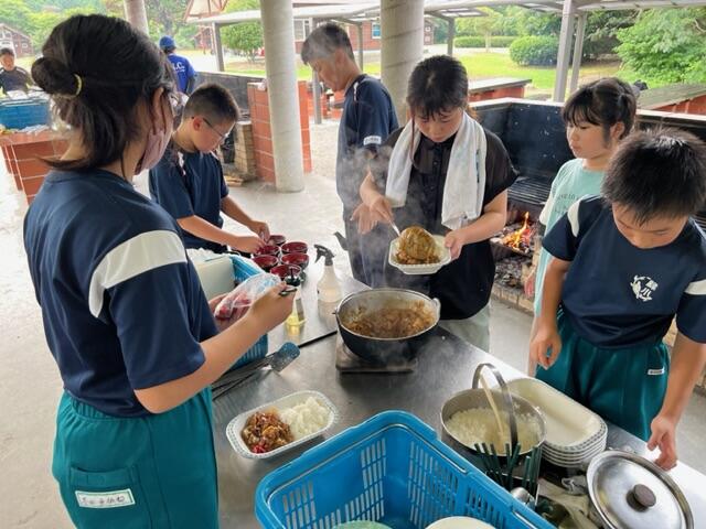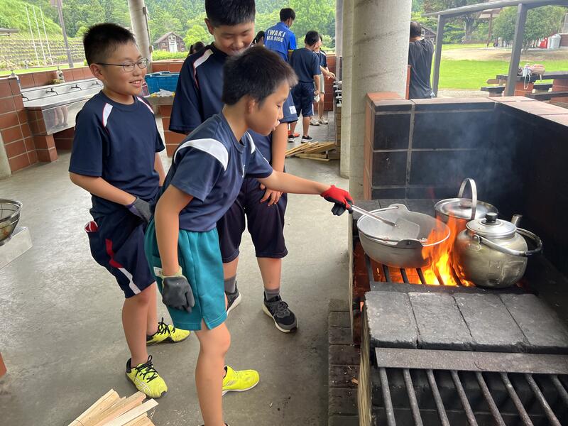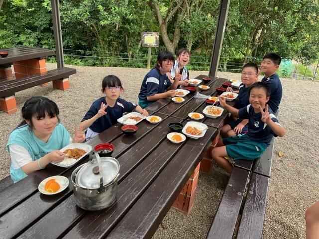 午後の後半は、野外炊飯です。家庭科で調理実習を経験しているものの、本格的な調理は初めてです。しかも、薪を焚いて火をおこします。スイッチポンで火力を得られるのとは違います。野菜を切って肉と炒め、コトコトとカレーを煮込みます。また、ご飯もコッヘルで炊きました。「みんなで協力して作ると、おいしいね」が子どもたちの感想です。
