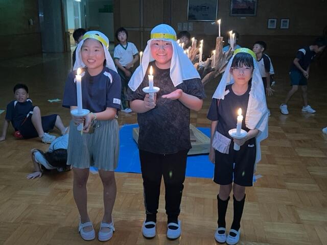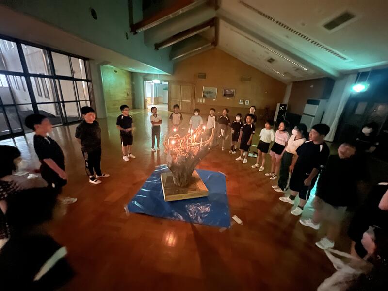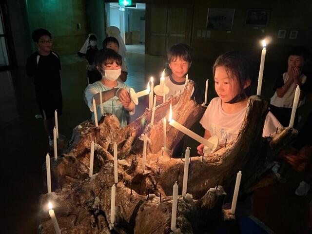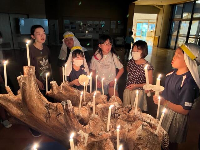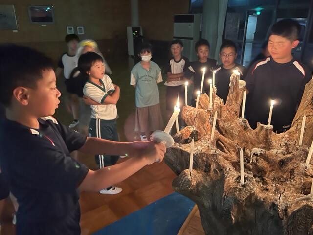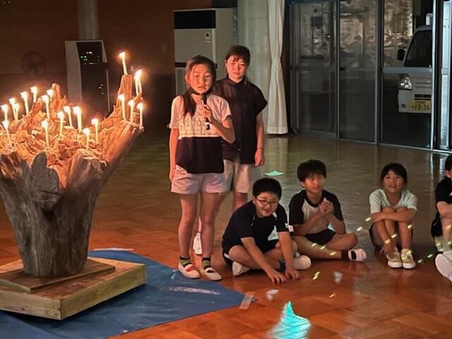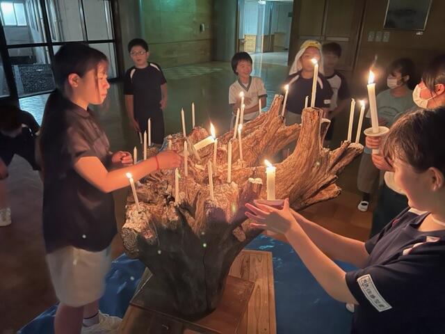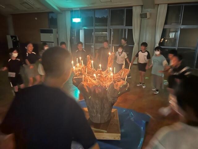 雨天のため、外でのキャンプファイヤーから室内でのキャンドルファイヤーに変更です。薪のようなダイナミックさはありませんが、ろうそくのを囲んで、楽しいスタンツなどで盛り上がりました。いわきの夜は静かに更けていきます。今日一日、みんな元気に活動できました。