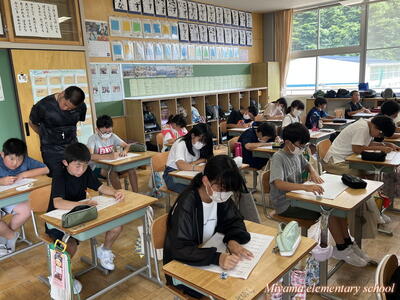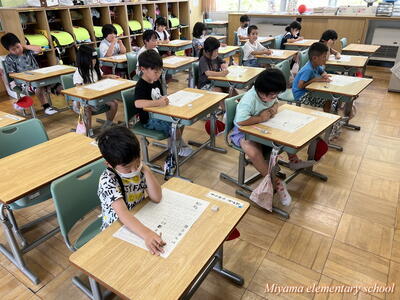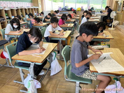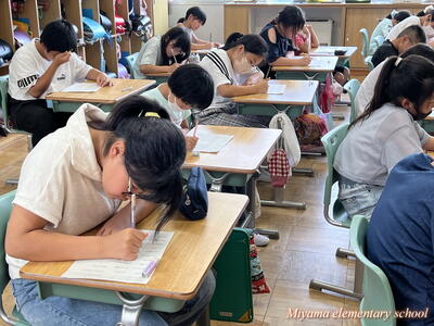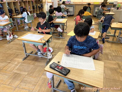 今日のドリルタイムは、国語コンテストでした。ひらがなや漢字の書き取り、言葉の問題など、国語の基礎的な力を問うテストに挑戦しました。暑い日でしたが、みんな集中して取り組んでいました。何点であっても、間違えた問題を復習して身に付けることが大切です。テストが返却されてからが勝負です。