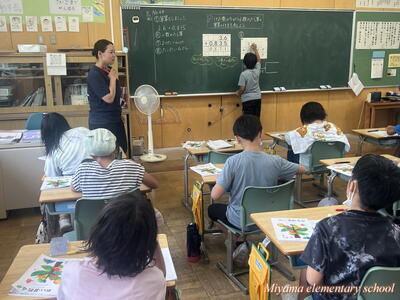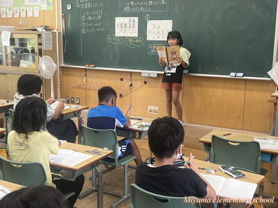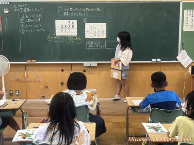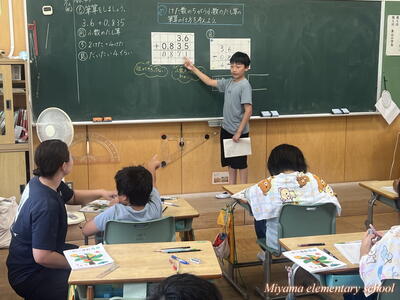 4年生は、算数で小数のたし算を学習しています。3.6+0.835のようにけた数の異なるたし算、筆算にするとミスしやすい問題です。子どもたちは、なぜ位をそろえるのか、位をそろえるとはどういうことかを、これまでの学習をもとにして考えていました。4年生は、自分の考えを友達に伝えようと積極的です。伝えることは、自分の考えを整理することにもなりますし、新しい考えを共有することもできます。考えを伝えることはどんな学習でも大切にしたいですね。