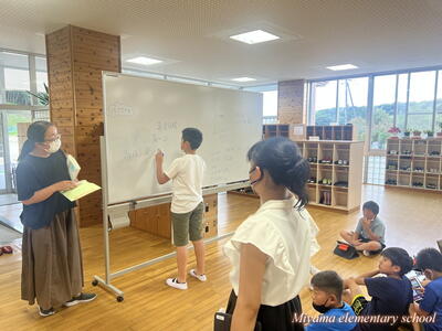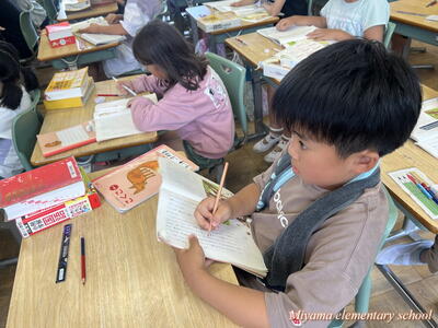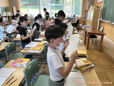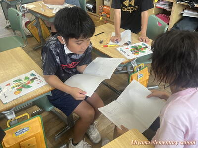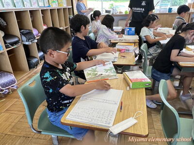 3年生は、国語の学習で登場人物の変化に気をつけて読む学習をしています。直接「悲しい」「うれしい」という表現がなくても、登場人物の行動や発言から、気持ちを想像していきます。ちょっとあいまいな表現はすぐに国語辞典を引いて意味を確かめます。辞書も素早く引けるようになりました。登場人物「りいこ」の気持ちを、様々な角度から読み合っていく様子が、とても楽しそうです。