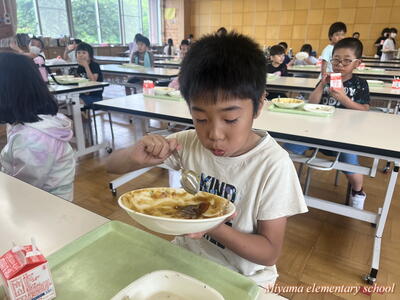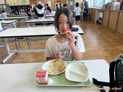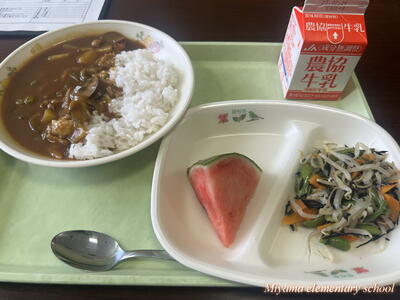 今日の給食は、夏メニューでした。夏野菜カレーにひじきの和え物、そして小玉スイカです。スイカはみんな大好きなんですね。赤い部分をきれいに食べきる子がたくさんいました。「おうちではカブトムシって言われています」という子も。納得です。