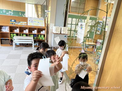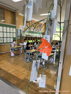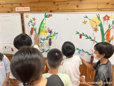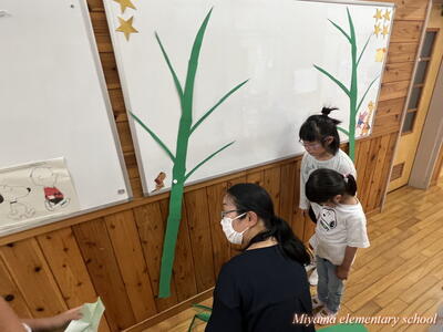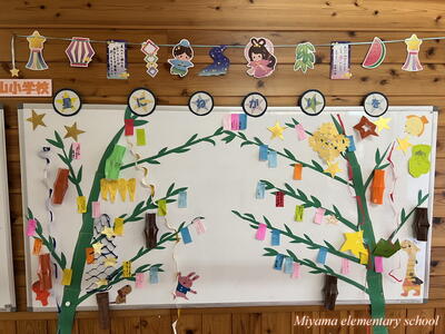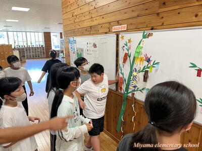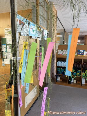 4年生は、宿泊学習で予定していた星空観察が、雨天のためできなかったそうです。明日は七夕。先生方が七夕飾りの掲示を作ったり、笹をもってきたりと七夕祭りの準備をしてくださいました。子どもたちは短冊に願いを書きます。どんな願いかは授業参観のときにご覧ください。明日は晴れて星空が見られるといいですね。