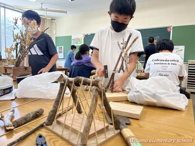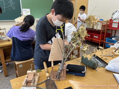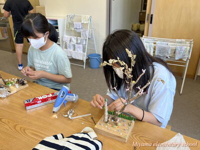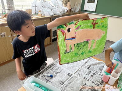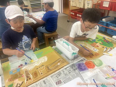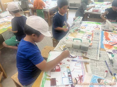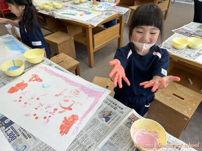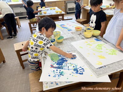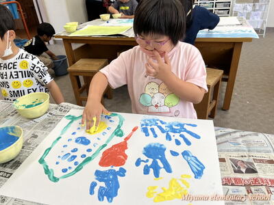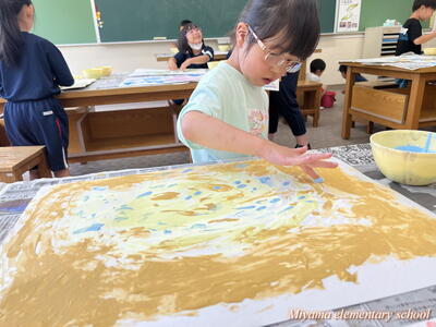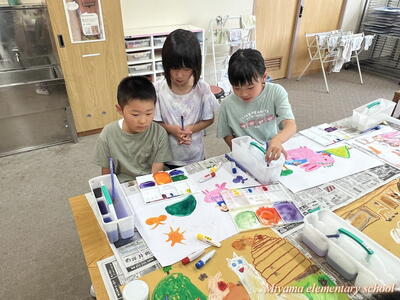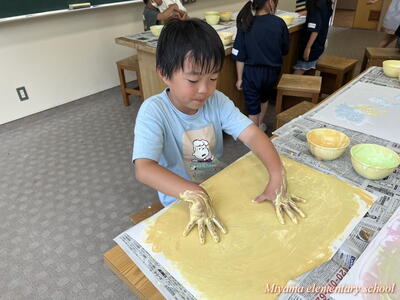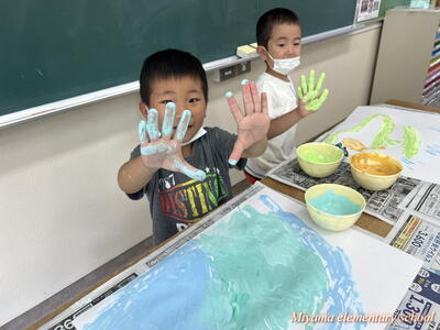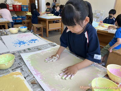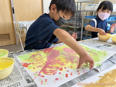 図工の学習では、各学年に応じて様々な表現方法を学びます。2年生は、クレヨンと絵の具を使ってきれいな色で表す。6年生は、校舎周辺の木々を使って自然物と人工物を使って表す。1年生は、液体粘土に絵の具をまぜて、手や指を使って大胆に表す。各学年の表現方法も様々ですが、さらにその方法を使って表す一人一人の作品も様々。個性が出ます。