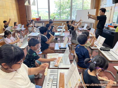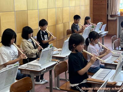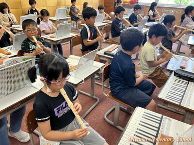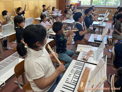 先週リコーダーの持ち方を学んでいた3年生。今日は、すでに3つの音を出せるようになっていました。リコーダーできれいな音を出すためには、指の腹の部分でしっかりと穴を塞ぐことが大事ですし、指を動かしたときに他の指がずれないようにしなければなりません。(・・・イメージがつくでしようか?)結構、大変なのです。でも、3年生はきれいな音が出ていました。3つの音を使って曲も演奏できます。