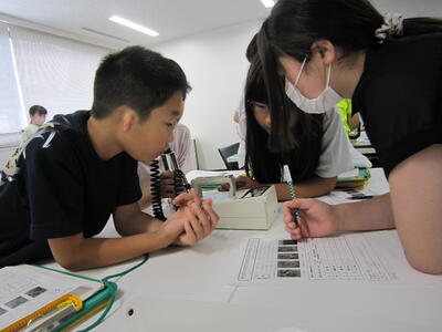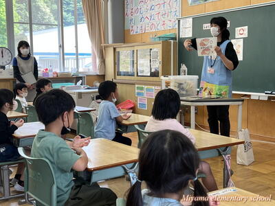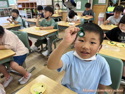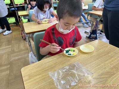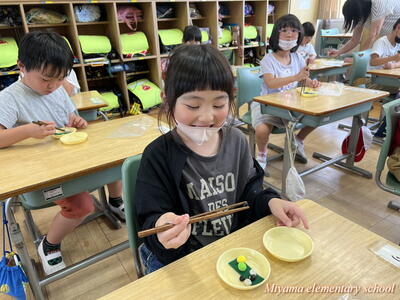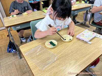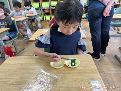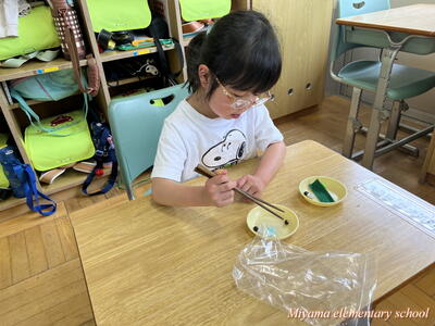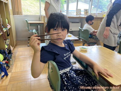1年生は食に関する学習をしました。テーマは食事のマナー、特に箸の使い方です。姿勢良く食べると消化にもよいことや、「まよい箸」「よせ箸」などのお箸のマナーがあることを学びました。そして、箸の使い方の練習です。正しい持ち方を確認した後、小さな物をつまんだり、海苔のようなフェルトを巻いてみたりしました。箸は練習することで、正しく使えるようになるそうです。おうちでも意識してやってみましょうね。