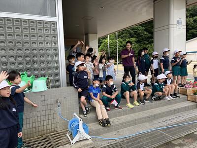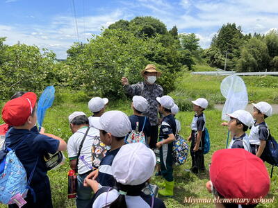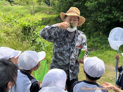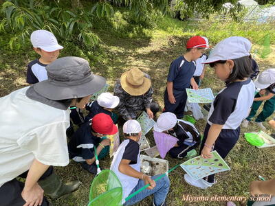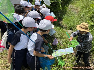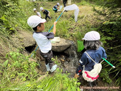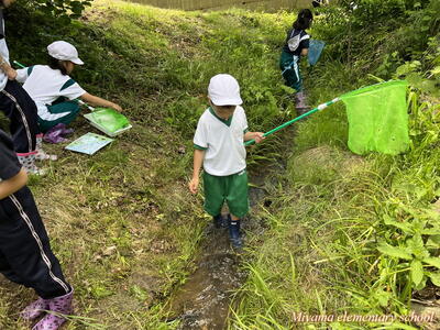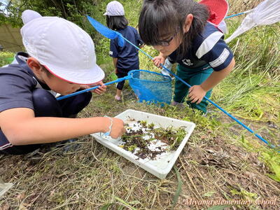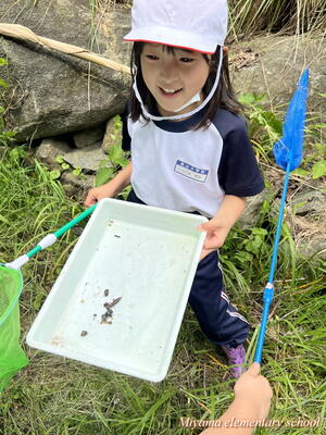 2年生は、地域の小川をたんけんし、生き物をさがしました。今日さがしたのは、川の中にいるとても小さな生き物です。もりの案内人ゴリさんが一緒に行ってくれました。川の中を網ですくうと、カワゲラ、ヒラタカゲロウ、ヘビトンボ、サワガニなどがとれました。小さいけどかわいらしい生き物に、子どもたちも感動! ゴリさんの話では、ほとんどがきれいな川にしかいない生き物だそうです。