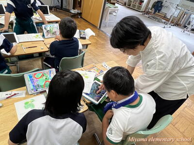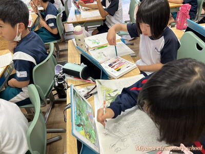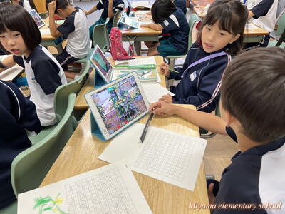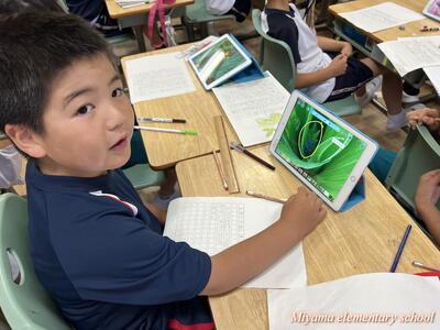 2年生は、育てている野菜の観察をしました。最近の暖かさと雨のおかげで、ぐんぐん大きく育っています。タブレットを使って写真を撮影し、細かい部分もよ~く観察していました。「小さいけどおしべが見えた」「くきには細かい毛がついてるよ」など。でも、タブレットでは分からないさわった感じやにおいなどは、もう一度実物を観察して確かめていました。
