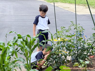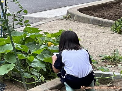 2023年6月17日 10時00分2年生は、育てている野菜の観察をしました。最近の暖かさと雨のおかげで、ぐんぐん大きく育っています。タブレットを使って写真を撮影し、細かい部分もよ~く観察していました。「小さいけどおしべが見えた」「くきには細かい毛がついてるよ」など。でも、タブレットでは分からないさわった感じやにおいなどは、もう一度実物を観察して確かめていました。
