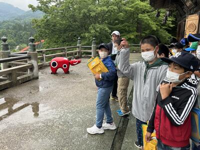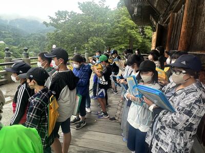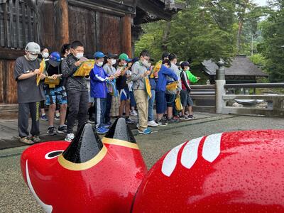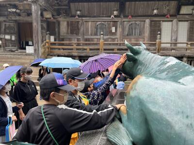 2023年6月22日 10時40分予定どおり第1目的地、会津柳津町の福満虚空蔵菩薩 円蔵寺に到着しました。只見川沿いにそびえ立つ霊験あらたかなお寺を、ガイドさんの案内で見学しました。お正月に行われる「七日堂裸詣り」で、男の人たちが競って登るあの「大鰐口」も見ました。お寺の清浄な空気感に、心が洗われます。次は、赤べこ絵付け体験です。