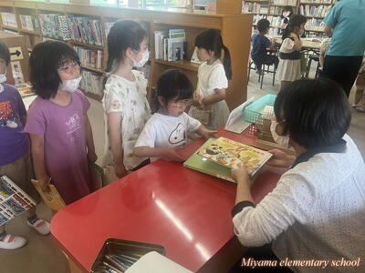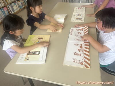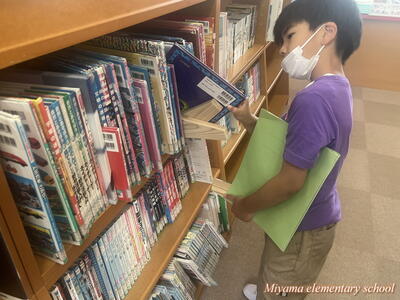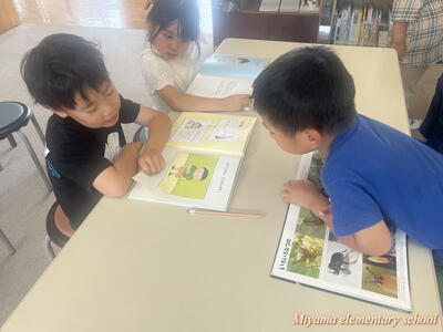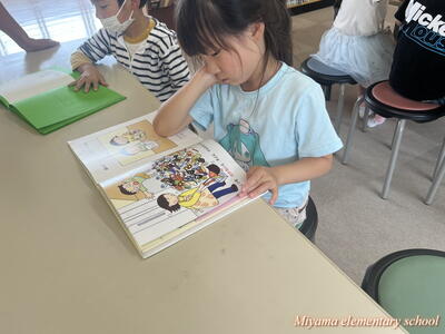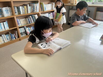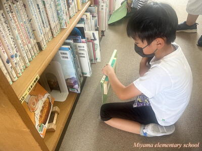 2023年7月5日 19時32分美山小では、読書活動を大切にしています。1年生も図書室をたくさん利用し、すでに借りた本は10冊を超えています。今日は図鑑のような本ではなく、物語などの絵本を読んでみることになりました。じっくりと本を選ぶ姿も、友達と本について語る姿も、一人本の世界に入り込んでいる姿も、みやまっ子のめざす姿です。本と向き合う姿、1年生だってかっこいいと思いませんか?