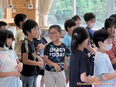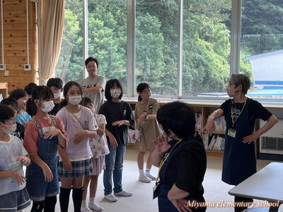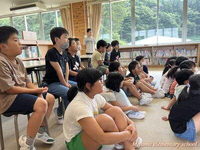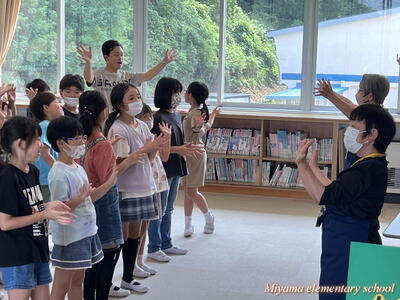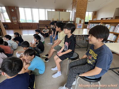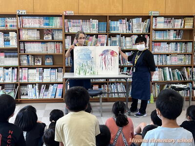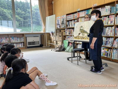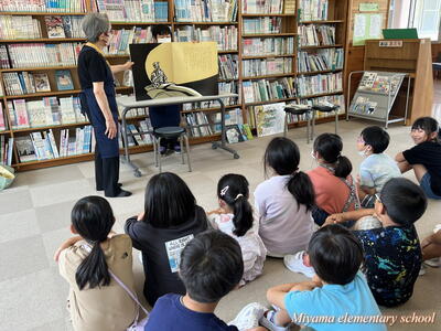 2023年9月5日 12時45分3年生を対象に、お話の会「どんぐり」の皆さんによる読み聞かせが行われました。「スイミー」や「モチモチの木」など、国語の教科書にも載っている物語を、迫力ある大型絵本で読んでいただきました。途中「アジのひらき」という手遊び歌を楽しみながら、本に親しむ時間となりました。