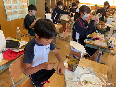 2023年10月19日 17時58分きらめき劇場とは、6年生の図工の題材名です。作品にLEDライトを当てて、その光り方、輝き方の効果を考えながら、作品を作り上げます。ペットボトルに水を入れて光の効果を高めたり、キラキラする材料を貼り付けて輝き方に変化を付けたりします。突然、空き缶のプルタブを集め出す子どもたち。プルタブだって、ものによってはキラキラするそうです。どんなきらめき劇場になるのか、とても楽しみです。