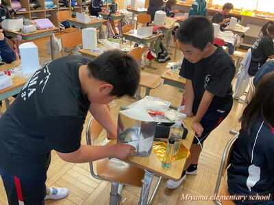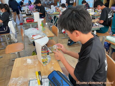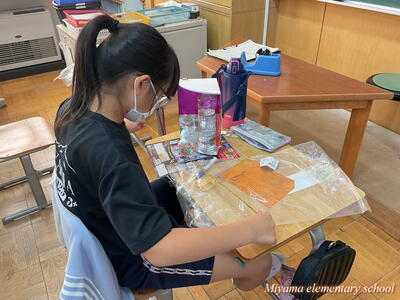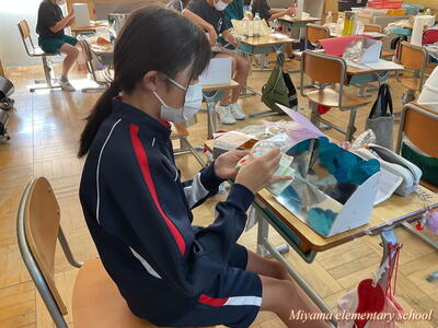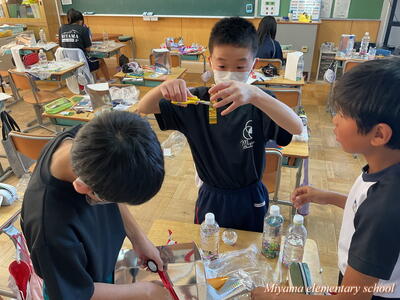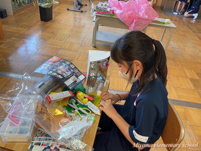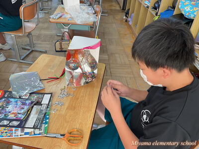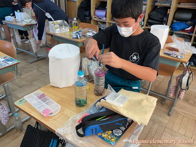 きらめき劇場とは、6年生の図工の題材名です。作品にLEDライトを当てて、その光り方、輝き方の効果を考えながら、作品を作り上げます。ペットボトルに水を入れて光の効果を高めたり、キラキラする材料を貼り付けて輝き方に変化を付けたりします。突然、空き缶のプルタブを集め出す子どもたち。プルタブだって、ものによってはキラキラするそうです。どんなきらめき劇場になるのか、とても楽しみです。