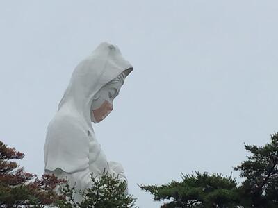 マスクをした慈母観音様に迎えられ、会津入りをしました。小雨の中、これから飯盛山に出発です。