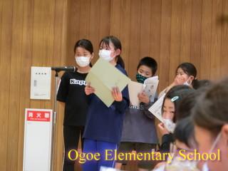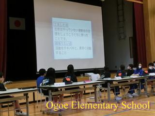 各学級の代表者が、今年の水泳学習のめあてを発表すると共に、体育担当の先生から、プールで守る「かぶとむし」についてお話がありました。