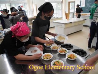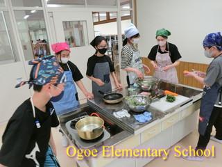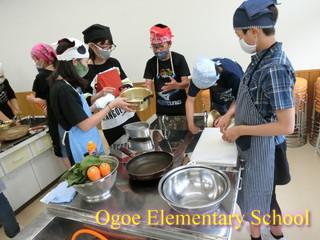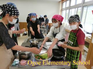 県独自の非常事態期間で停止していた感染性が高い学習活動も、期間の解除を受け、感染症対策をなおも続けながら、徐々に実施していくようにしました。6年生も家庭科の調理実習を行い、「野菜いため」と「ホウレンソウのおひたし」作りをおこないました