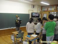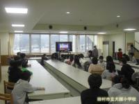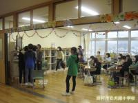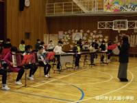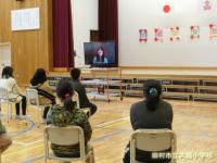 学年毎に別々の場所に集まり、大型モニターを見ながら、クイズを楽しんだり6年生への感謝のメッセージを伝えたりしました。鼓笛の移杖式も行われました。
