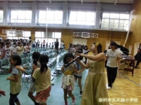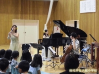「ソレイユ」とはフランス語で「太陽」や「ひまわり」のことです。太陽のように熱く、ひまわりのように明るい音楽が、大越小学校に届けられました。ピアノ・クラリネット・マリンバ・チェロの楽器から奏でられる音色に、子どもたちは身体全体でリズムを刻みながら楽しく鑑賞することができました。