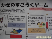 かぜやインフルエンザにかかりやすい時期です。学校では、マスクの着用とうがい・手洗いの励行について指導しています。校舎内には、養護の先生手作りの資料もたくさん掲示されています。栄養や睡眠にも十分配慮して、かぜに負けない体を作りましょう。