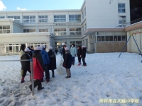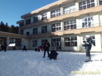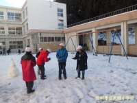 今日は青空が広がり、昨日の雪もだいぶ溶けましたが、まだ一面に雪が残っている昼休みの中庭の様子です。こんな少しの雪でも、やっぱり子どもたちは遊びの天才。小さな雪だるまを作ったり、氷の板を見つけては、「鉄砲の形みたいでしょう」と教師に見せに来てくれたりと元気に遊びました。