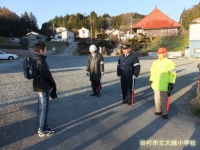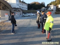 大越小学校児童の安全な登下校のために、いつもご指導くださっている皆様に、児童代表が感謝の言葉を伝えました。暑い日も寒い日も本当にありがとうございます。おかげさまで事故なく登下校することができました。お体に気をつけて、来年もよろしくお願いいたします。