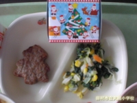 2015年12月21日 15時24分今日の給食はクリスマスバージョンでした。もみの木の形をしたハンバーグにクリスマスケーキ。しかもケーキはセレクトでした。さらにご飯は人参ピラフ。子どもたちは、特別メニューに大喜びでした。