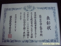 去る11月2日、福島県文化センターにおいて「平成27年度教育・文化関係表彰式」が行われ、本校PTAが功績顕著な団体として表彰されました。学年行事や資源物回収、親子読書運動、ベルマーク収集など活発な活動が認められたものです。当日は、浅理PTA会長が出席し、表彰状を受けとりました。県内では二つのPTAのみが表彰されました。