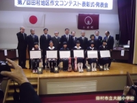 本校6年武田さんが標記のコンテストで優秀賞に輝き、11月6日(金)小野町で行われた表彰式に出席しました。武田さんは、登下校時に見守って下さっている方々への感謝の気持ちを「明るいあいさつ」にこめたいと綴りました。表彰式では、入賞作品の発表もありましたが、堂々と心をこめて発表し、大きな拍手をいただきました。