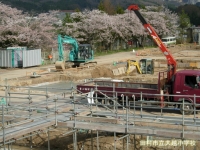 満開の桜の校庭で改築工事が着々と進んでいます。