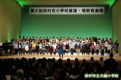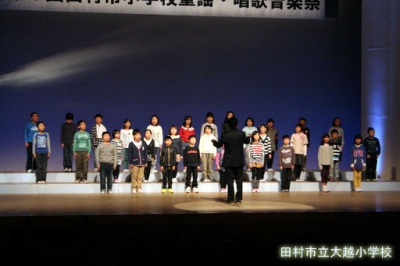 大越小学校の今年の担当は冬の歌です。「スキーの歌」と「ふじ山」の2曲を、美しい声で歌うことができました。最後に、参加者全員で「ふるさと」を合唱しました。