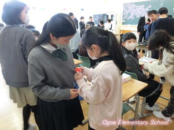 教室では、5年生が卒業生にお祝いのお花をつけています。