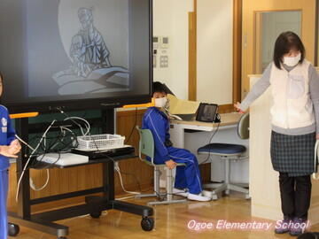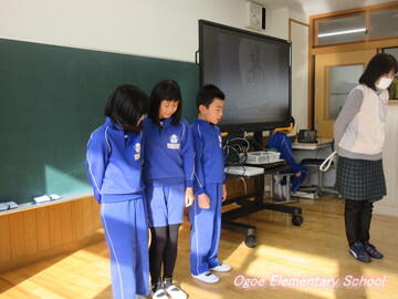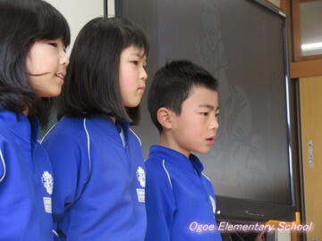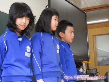 今回の発表は3名。ディスプレイに挿絵を表示する児童もいます。