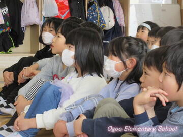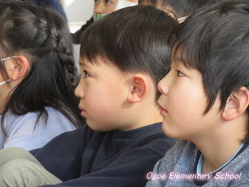真剣に聴く1年生。モチモチの木を語りかける3年生の代表児童。そして心の中で一緒に音読しながら見守る3年生。