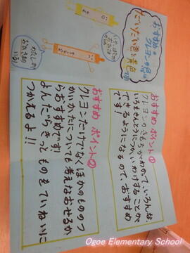 今回は授業に図書支援員の先生にも入っていただいて、「この本、気になる!」「読んでみようかな?」と本を手に取ってもらえるようなPOPの書き方について教えていただきました。